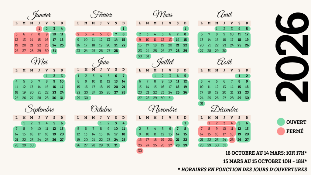 Du 30/08/2025 au 11/07/2026 les visites guidées sont à 10h30 et 14h